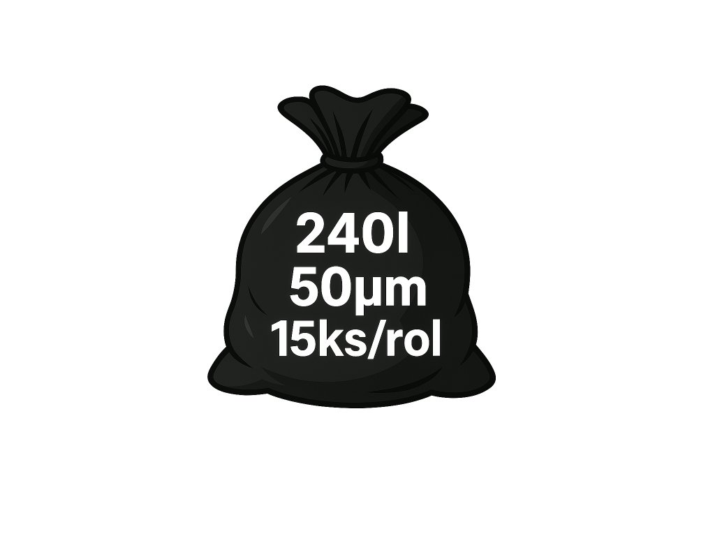 Velký pytel na odpad s velkým objemem 240 litrů, vyrobený z recyklovaného LDPE (nízkohustotní polyetylen). Díky rozměrům 1000× 1200 mm se hodí do větších odpadkových košů i pro samostatné použití. Barva dle zvolené varianty. Pytel je díky své pevnosti vhodný nejen na běžný směsný odpad, ale i na objemnější či těžší odpad. Vhodný do menších popelnic.