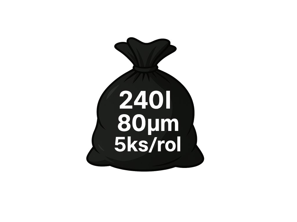 Velký pytel na odpad z recyklovaného LDPE o objemu 240 l, 80µm a rozměrech 1000 × 1200 mm. Vhodný na směsný i objemný odpad, černá barva zajišťuje diskrétnost obsahu. Ideální do domácností, kanceláří i provozů.